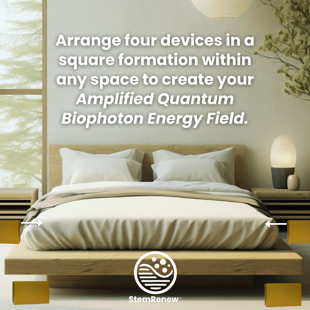 Arrange four StemRenew devices in a square formation, 6–12 feet apart in your space to create a 40X Amplified Field of Biophoton Energy!